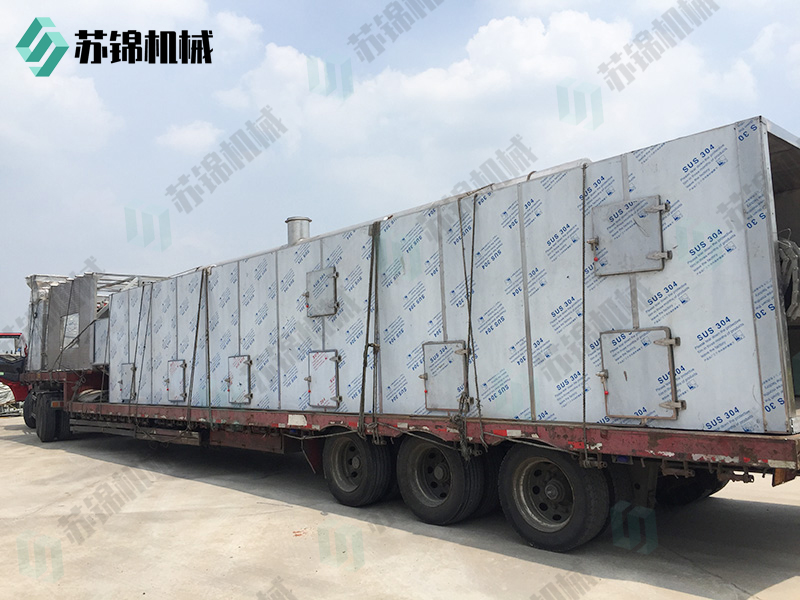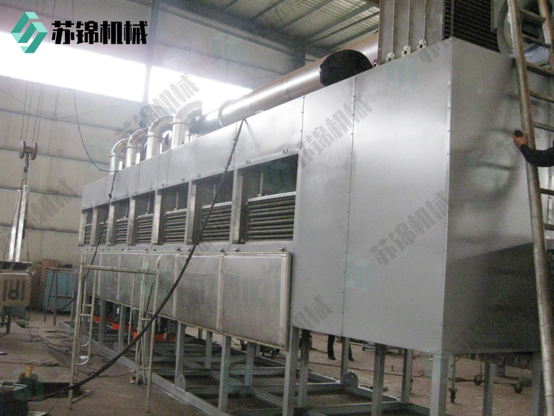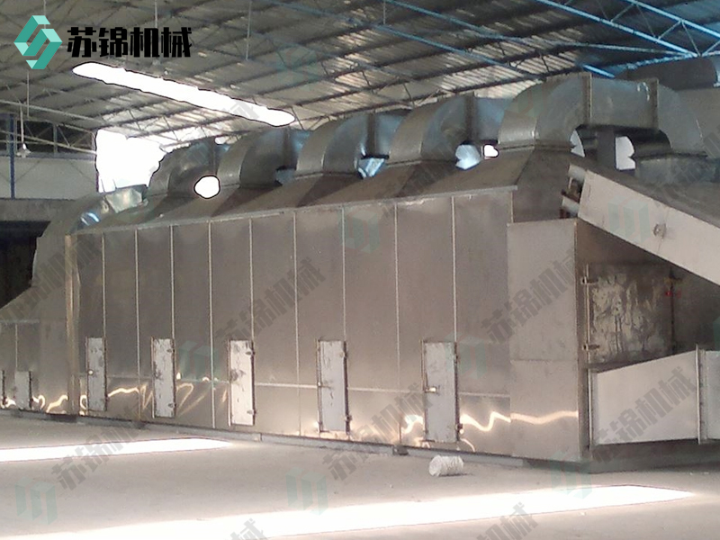 物料由加料器均匀地铺在网带上,网带采用12-60目不锈钢丝网。由传动装置拖动在干燥机内移动。干燥机由若干单元组成,每一单元热风独立循环,部分尾气由专门排湿风机排出,废气由调节阀控制,热气由下往上或由上往下穿过铺在网带上的物料,加热干燥并带走水分。网带缓慢移动,运行速度可根据物料温度自由调节,干燥后的成品连续落入收料器中。上下循环单元根据用户需要可灵活配备,单元数量可根据需要选取。