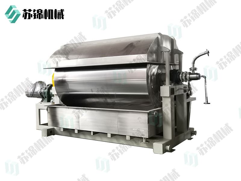 液体或泥浆状物料在水蒸汽或其它热载体加热的滚筒表面形成薄膜,并在滚筒转一圈的过程中便被干燥完毕,利用刮刀把产品刮下来,露出滚筒表面再次与原料接触形成薄膜进行干燥。