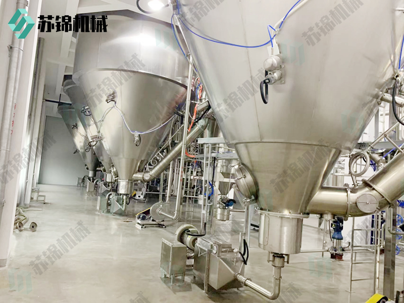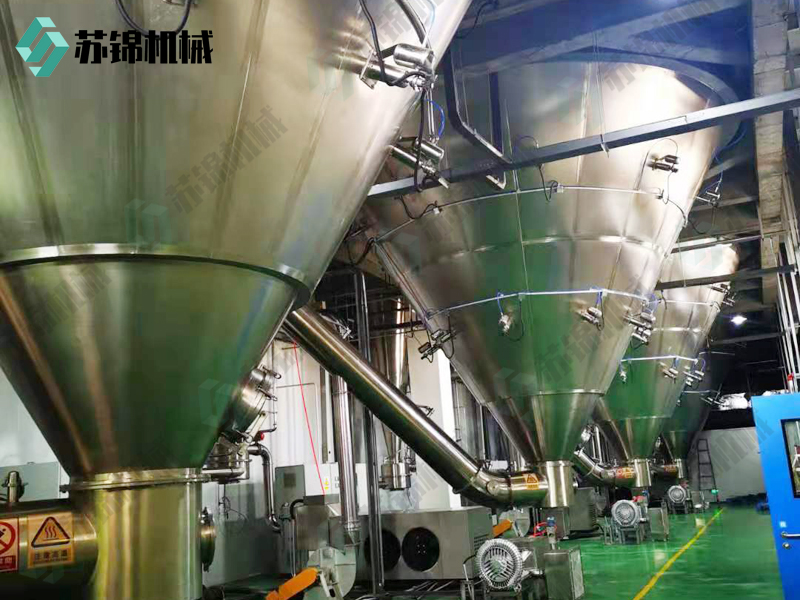 空气经空气过滤器后进入空气加热器,当空气加热器到给定的温度后以切线方向进入热风分配器,经热风分配器作用后的空气,均匀地、螺旋式地进入干燥室,同时料液由雾化器雾化为20~60um的雾滴,当雾滴与热空气接触后就迅速汽化干燥为粉末或颗粒产品。采用旋风风离器直接收集后经气力输送至效料仓,完成物料的冷却及输送,废气由风机排出口经水沫除尘器排出。