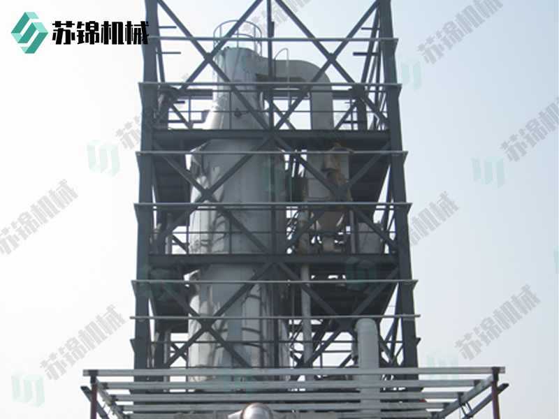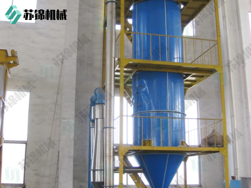 料液通过隔膜泵高压输入,喷出雾状液滴,然后同热空气并流下降,大部分粉粒由塔底排料口收集,废气及其微小粉末经旋风分离器分离,废气由抽风机排出,粉末由设在旋风分离器下端的授粉筒收集,风机出口还可装备二级除尘装置,回收率在96-98%以上。