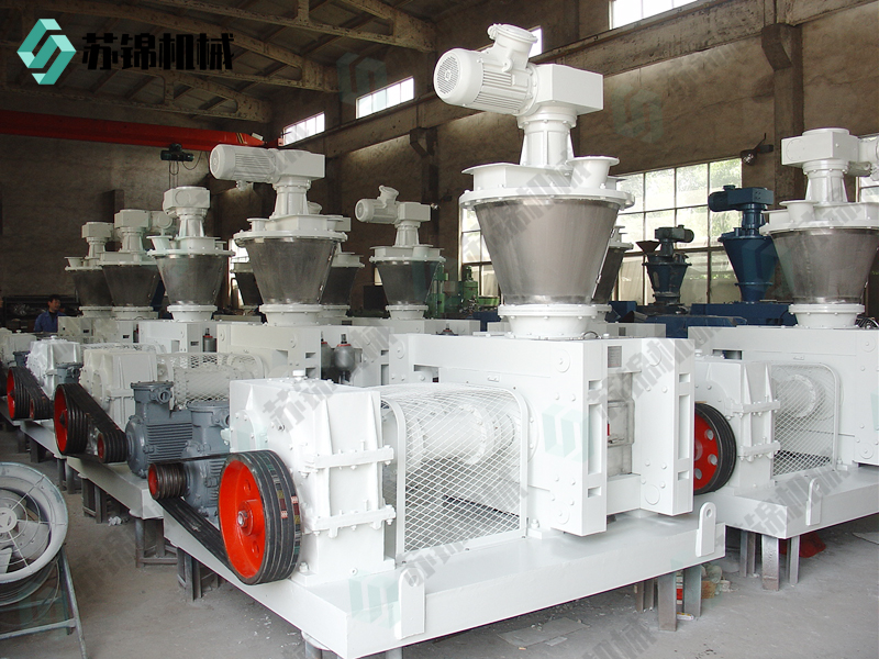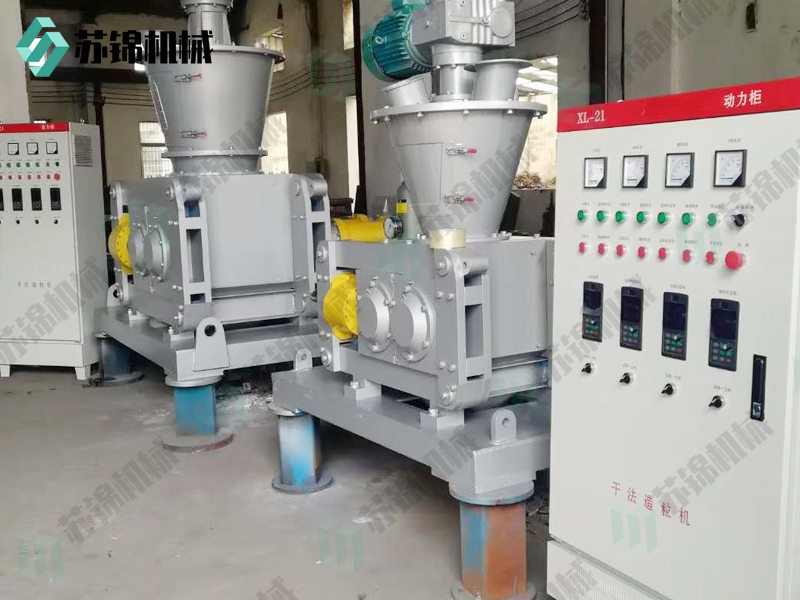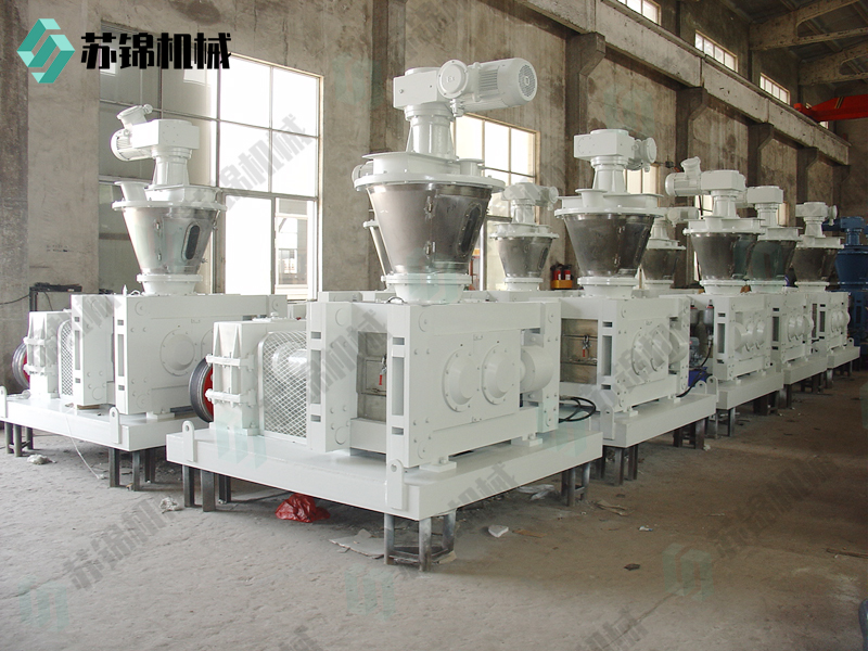 粉状物料由振动给料斗经横向螺旋送料器定量,均匀地加人轧片主料斗,使轧片主料斗内保持恒定的料粒,然后由轧片主料内的纵向锥螺旋对粉料进行预压缩并输送到两只压辊的弧形槽口,两只压辊表面均匀分布形状相同的半扁圆形弧槽或菱形槽,通过一对齿轮的啮合传动,使两只压辊等速,反向旋转,将锥螺旋输送至槽口的物料咬入槽内并瞬间强制压缩,物料经过压缩后随着压力逐渐减小在其弹力及重力作用下,从槽内脱落,进入破碎整粒系统,然后根据用户的粒度要求过筛、分级,得到符合质量要求的均匀颗粒状产品,筛下粉重新返回振动料斗循环利用。