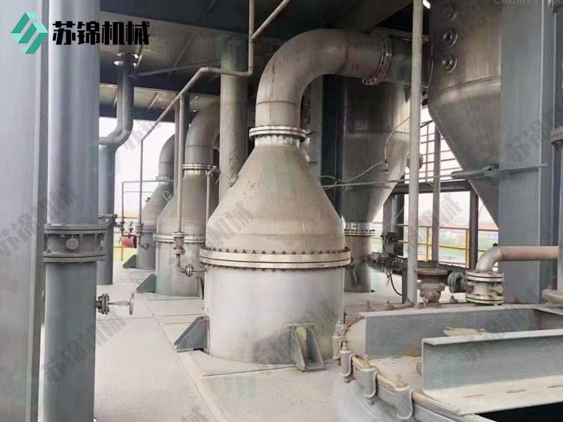 经过预热到设定温度的物料进入蒸发器的大管道,在与浓缩液混合后与壳程的饱和水蒸气进行换热,由于静压头的作用,温度升高后的物料没有蒸发,在结晶分离器中进行闪蒸,闪蒸产生的二次蒸汽则经过净化后进入蒸汽压缩机,加压升温后返回换热器壳程作为热源使用,冷凝下来的蒸馏水经蒸馏水罐收集后通过蒸馏水泵、通过蒸馏水板换回收热量后排出系统。浓缩液则在系统中继续浓缩蒸发,达到设计浓度后经出料泵排出系统,如果是结晶系统则需要再经过稠厚器和离心机分离出结晶,母液则继续返回蒸发器继续蒸发。