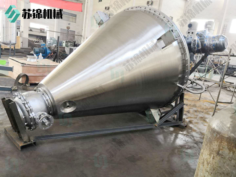 本机由加热锥体设有加热夹套,热源为热水、导热油或低压蒸汽,从而使锥体内壁保持一定的的温度。变频调速电机经平行斜齿轮减速机,驱动单螺带搅拌器旋转,带动物料沿锥型筒旋转并自下而上提升,物料到达高点后由重力和惯性作用,自动流向旋涡中心回到锥型筒体底部,整个过程使物料在锥型筒体内强制加热,相对对流、掺混,热量在物料中相互扩散,使物料作全方位的不规则往复运动,完成物料同单螺带和筒壁表面进行高频率传热交换,在短时间内达到加热干燥的效果。从而使物料内部水份不断蒸发,在真空泵的作用下,水蒸汽由真空泵引出,如须回收液体可加冷凝器、回收液储罐回收。干燥完成后,打开下部的出料阀出料。