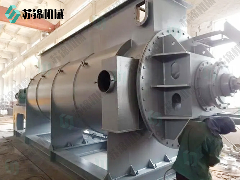 主轴的圆盘外缘装有弧板,使物料能沿着干燥机筒体向出料口方向缓慢移动。物料的干燥是通过蒸汽将主轴、圆盘加热,使物料充分接触,再通过引风机排出。干燥机主轴是通过电机与减速机构来带动旋转。蒸汽加热系统由旋转接头、金属软管、疏水器、截止阀、球阀、视孔、汽水分离器等组成,从而保证主轴圆盘始终充满饱和蒸汽,并保证冷凝水顺利排出。