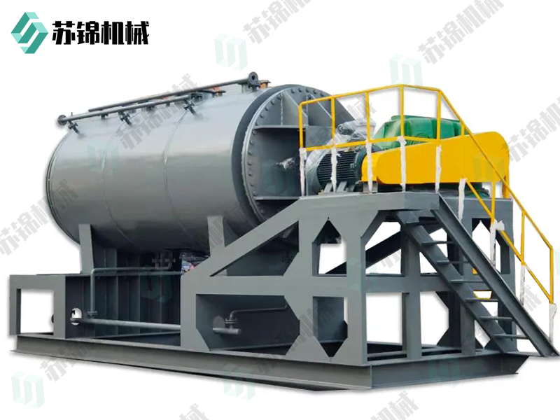 圆盘桨叶干燥机主要由筒体、圆盘主轴、传动机构和蒸汽加热系统、污泥上料装置、圆盘干燥机、预除尘旋风装置、间接冷凝热臭气回收装置、排湿风机、尾气生物除臭装置组成。筒体是带夹套的圆柱形,夹套内通入蒸汽,底部有排水口。筒体顶部有一个排气口,用以排出已蒸发的水蒸汽;一个进料口,湿物料由此加入干燥机内。筒体底部有一个排料口,用于排出已干燥的物料。筒体两端下部各有一个清扫排放口。筒体上方还装有挡料板,使转盘保持自洁。筒体内的主轴由一根空心主轴和空心圆盘组成。主轴通入蒸汽,并分配到圆盘内,冷凝水及不凝气通过旋转接头从轴端排出。