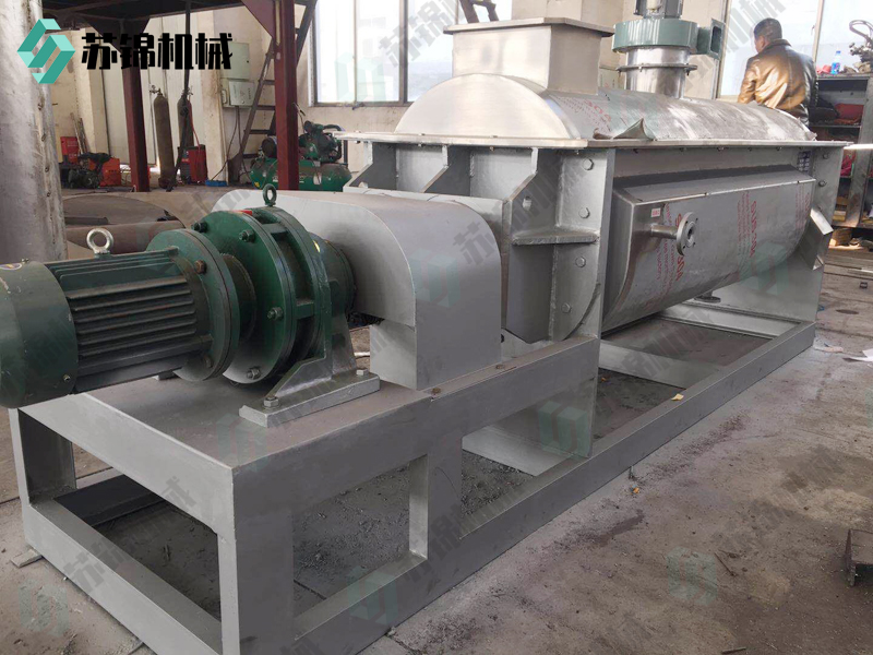 空心轴上密集排列着楔型中空浆叶,热介质经空心轴流经浆叶。单位有效容积内传热面积很大,热介质温度从-40℃到320℃,可以是水蒸汽,也可以是液体型:如热水、导热油等。间接传导加热,没有携带空气带走热量,热量均用来加热物料。热量损失仅为通过器体保温层向环境的散热。楔型浆叶传热面具有自清洁功能。物料颗粒与楔型面的相对运动产生洗刷作用,能够洗刷掉楔型面上附着物料,使运转中一直保持着清洁的传热面。浆叶干燥机的壳体为Ω型,壳体内一般安排二到四根空心搅拌轴。壳体有密封端盖与上盖,防止物料粉尘外泄而充分发挥作用。