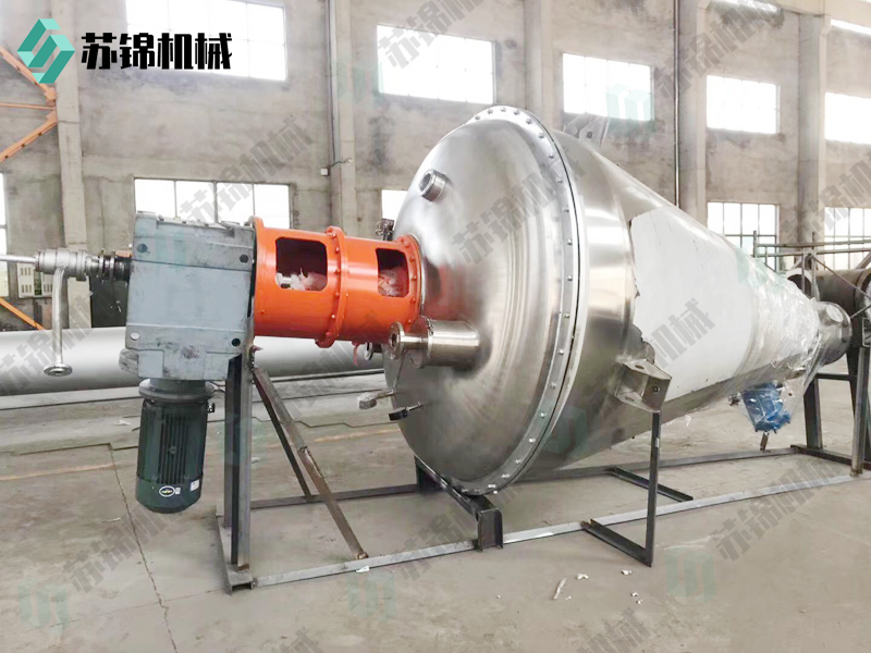 本机由加热锥体设有加热夹套,热源为热水、导热油或低压蒸汽,从而使锥体内壁保持一定的的温度。变频调速电机经平行斜齿轮减速机,驱动单螺带搅拌器旋转,带动物料沿锥型筒旋转并自下而上提升,物料到达高点后由重力和惯性作用,自动流向旋涡中心回到锥型筒体底部,整个过程使物料在锥型筒体内强制加热,相对对流、掺混,热量在物料中相互扩散,使物料作全方位的不规则往复运动,完成物料同单螺带和筒壁表面进行高频率传热交换,在短时间内达到加热干燥的效果。从而使物料内部水份不断蒸发,在真空泵的作用下,水蒸汽由真空泵引出,如须回收液体可加冷凝器、回收液储罐回收。干燥完成后,打开下部的出料阀出料。