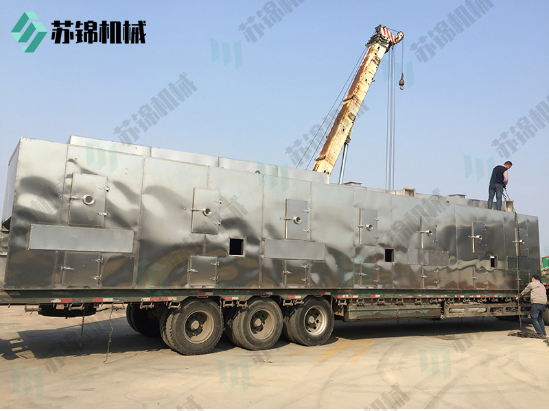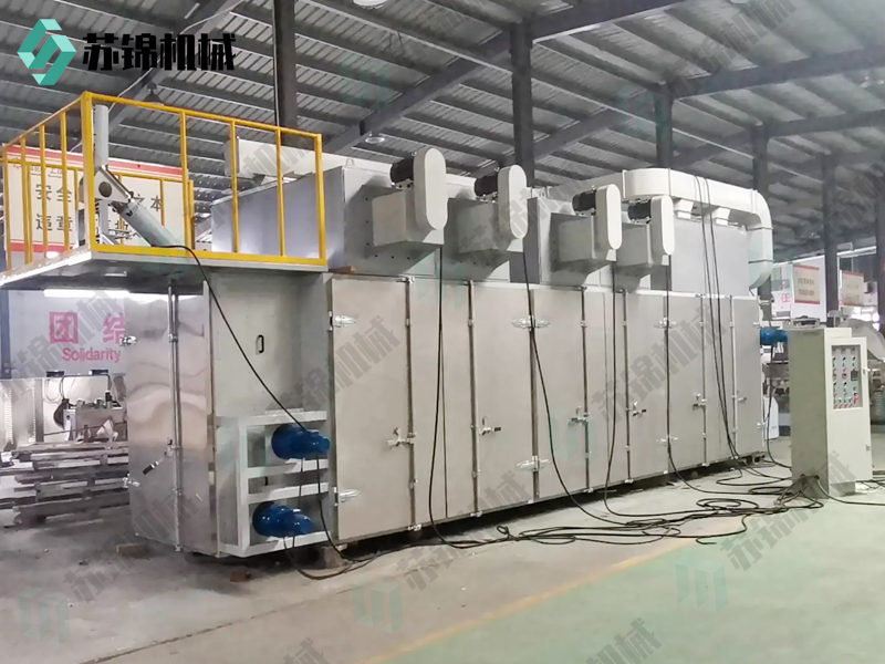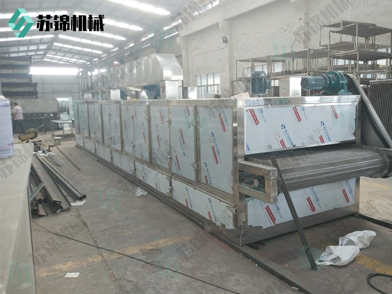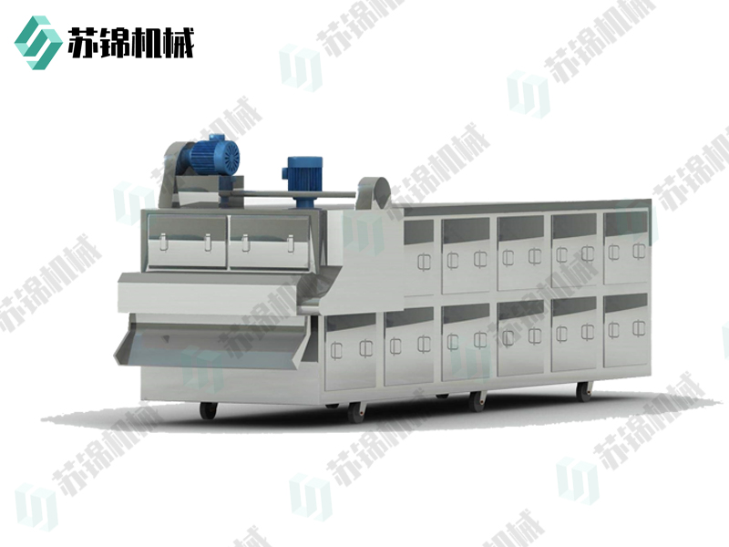 物料由加料器均匀地铺在网带上,网带采用12-60目不锈钢丝网。由传动装置拖动在干燥机内移动。干燥机由若干单元组成,每一单元热风独立循环,部分尾气由专门排湿风机排出,废气由调节阀控制,热气由下往上或由上往下穿过铺在网带上的物料,加热干燥并带走水分。网带缓慢移动,运行速度可根据物料温度自由调节,干燥后的成品连续落入收料器中。上下循环单元根据用户需要可灵活配备,单元数量可根据需要选取。