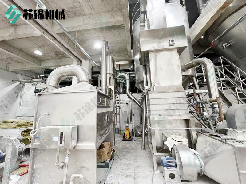 空气经空气过滤器后进入空气加热器,当空气加热器到给定的温度后以切线方向进入热风分配器,经热风分配器作用后的空气,均匀地、螺旋式地进入干燥室,同时料液由雾化器雾化为20~60um的雾滴,当雾滴与热空气接触后就迅速汽化干燥为粉末或颗粒产品。采用旋风风离器直接收集后经气力输送至效料仓,完成物料的冷却及输送,废气由风机排出口经水沫除尘器排出。