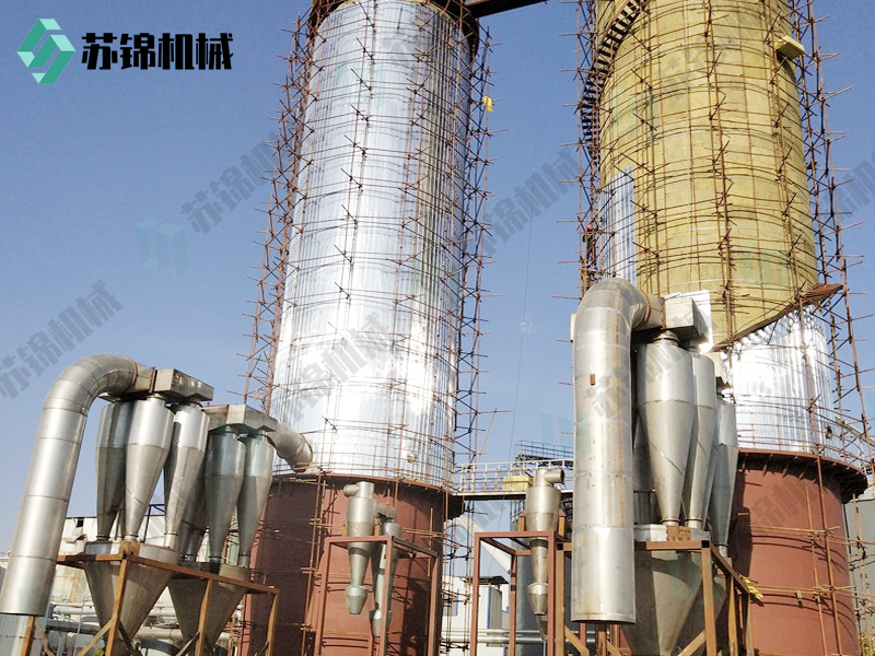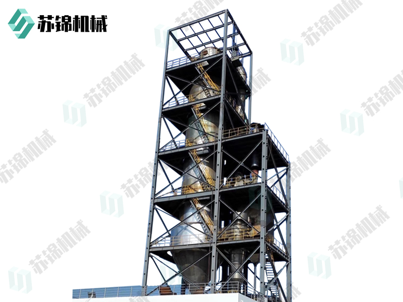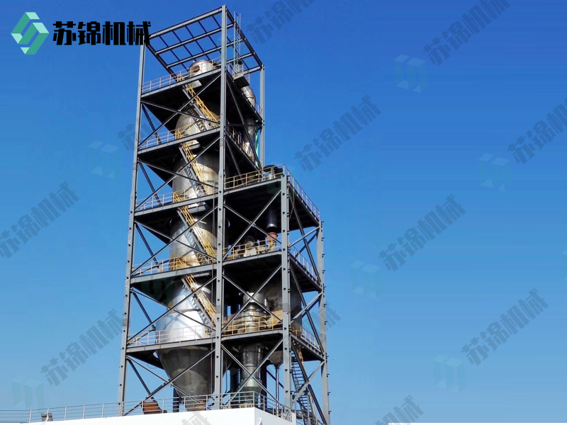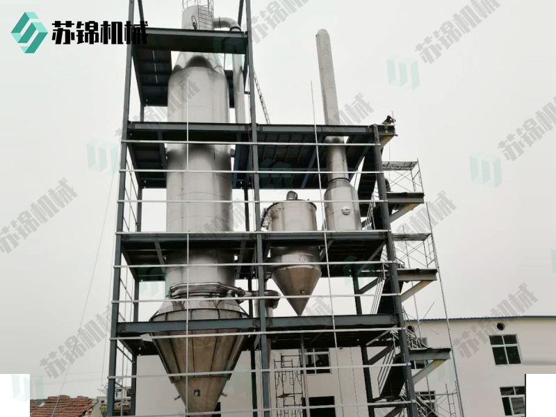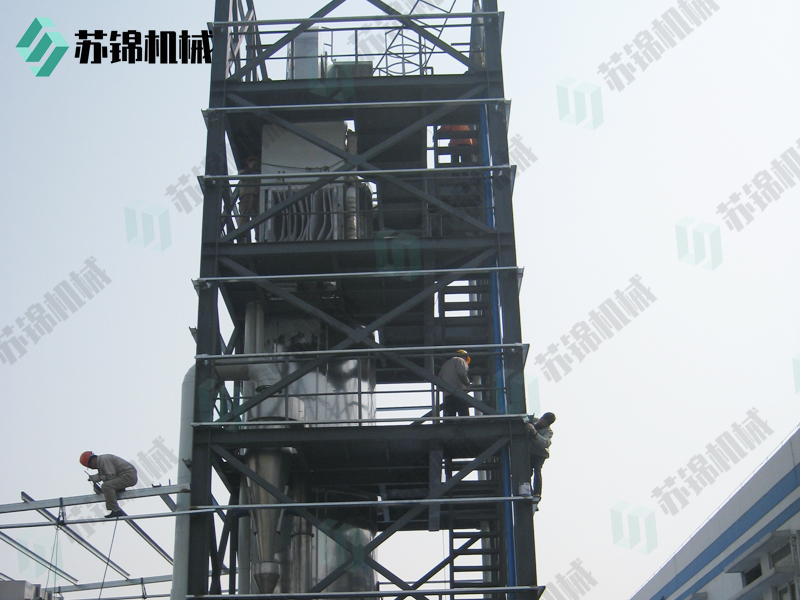 料液通过隔膜泵高压输入,喷出雾状液滴,然后同热空气并流下降,大部分粉粒由塔底排料口收集,废气及其微小粉末经旋风分离器分离,废气由抽风机排出,粉末由设在旋风分离器下端的授粉筒收集,风机出口还可装备二级除尘装置,回收率在96-98%以上。