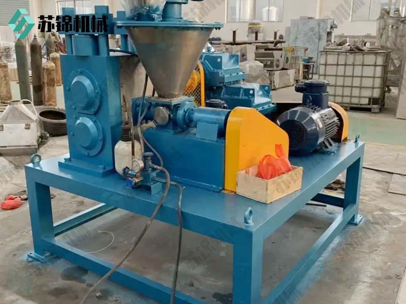 粉状物料由振动给料斗经横向螺旋送料器定量,均匀地加人轧片主料斗,使轧片主料斗内保持恒定的料粒,然后由轧片主料内的纵向锥螺旋对粉料进行预压缩并输送到两只压辊的弧形槽口,两只压辊表面均匀分布形状相同的半扁圆形弧槽或菱形槽,通过一对齿轮的啮合传动,使两只压辊等速,反向旋转,将锥螺旋输送至槽口的物料咬入槽内并瞬间强制压缩,物料经过压缩后随着压力逐渐减小在其弹力及重力作用下,从槽内脱落,进入破碎整粒系统,然后根据用户的粒度要求过筛、分级,得到符合质量要求的均匀颗粒状产品,筛下粉重新返回振动料斗循环利用。