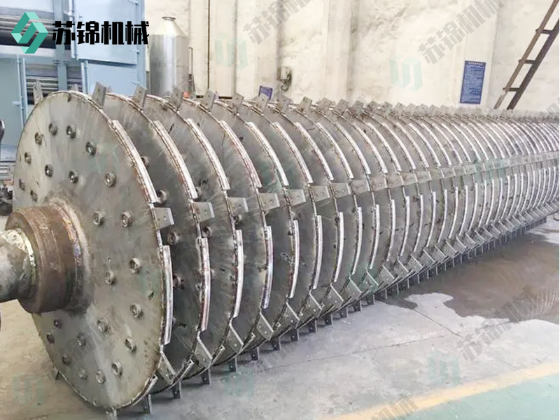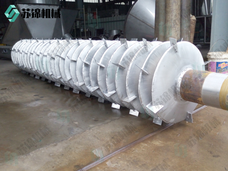 主轴的圆盘外缘装有弧板,使物料能沿着干燥机筒体向出料口方向缓慢移动。物料的干燥是通过蒸汽将主轴、圆盘加热,使物料充分接触,再通过引风机排出。干燥机主轴是通过电机与减速机构来带动旋转。蒸汽加热系统由旋转接头、金属软管、疏水器、截止阀、球阀、视孔、汽水分离器等组成,从而保证主轴圆盘始终充满饱和蒸汽,并保证冷凝水顺利排出。