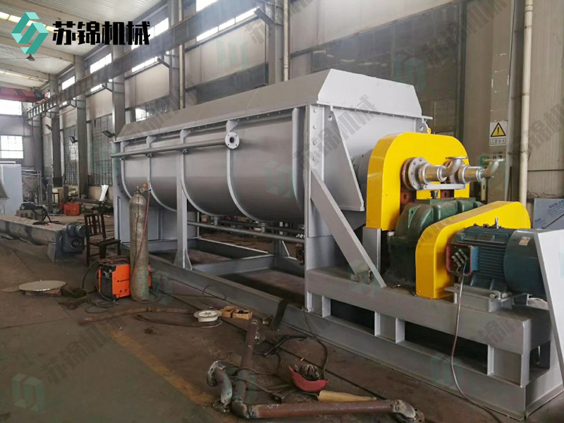 空心轴上密集排列着楔型中空浆叶,热介质经空心轴流经浆叶。单位有效容积内传热面积很大,热介质温度从-40℃到320℃,可以是水蒸汽,也可以是液体型:如热水、导热油等。间接传导加热,没有携带空气带走热量,热量均用来加热物料。热量损失仅为通过器体保温层向环境的散热。楔型浆叶传热面具有自清洁功能。物料颗粒与楔型面的相对运动产生洗刷作用,能够洗刷掉楔型面上附着物料,使运转中一直保持着清洁的传热面。浆叶干燥机的壳体为Ω型,壳体内一般安排二到四根空心搅拌轴。壳体有密封端盖与上盖,防止物料粉尘外泄而充分发挥作用。