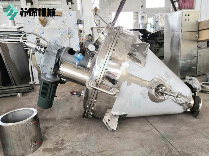 本机由加热锥体设有加热夹套,热源为热水、导热油或低压蒸汽,从而使锥体内壁保持一定的的温度。变频调速电机经平行斜齿轮减速机,驱动单螺带搅拌器旋转,带动物料沿锥型筒旋转并自下而上提升,物料到达高点后由重力和惯性作用,自动流向旋涡中心回到锥型筒体底部,整个过程使物料在锥型筒体内强制加热,相对对流、掺混,热量在物料中相互扩散,使物料作全方位的不规则往复运动,完成物料同单螺带和筒壁表面进行高频率传热交换,在短时间内达到加热干燥的效果。从而使物料内部水份不断蒸发,在真空泵的作用下,水蒸汽由真空泵引出,如须回收液体可加冷凝器、回收液储罐回收。干燥完成后,打开下部的出料阀出料。